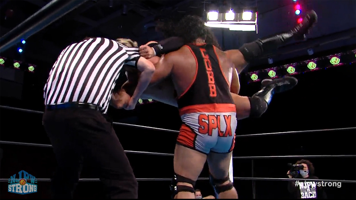Kenta defeated Jeff Cobb through some typical Bullet Club shenanigans. Kenta grabbed the official’s shirt as Cobb lifted him up for Tour of the Islands. Kenta shoved Cobb into the official as he was recovering in a corner. Cobb would have pinned Kenta with a gut-wrench suplex but the official was still curled up in a ball of pain in the corner.