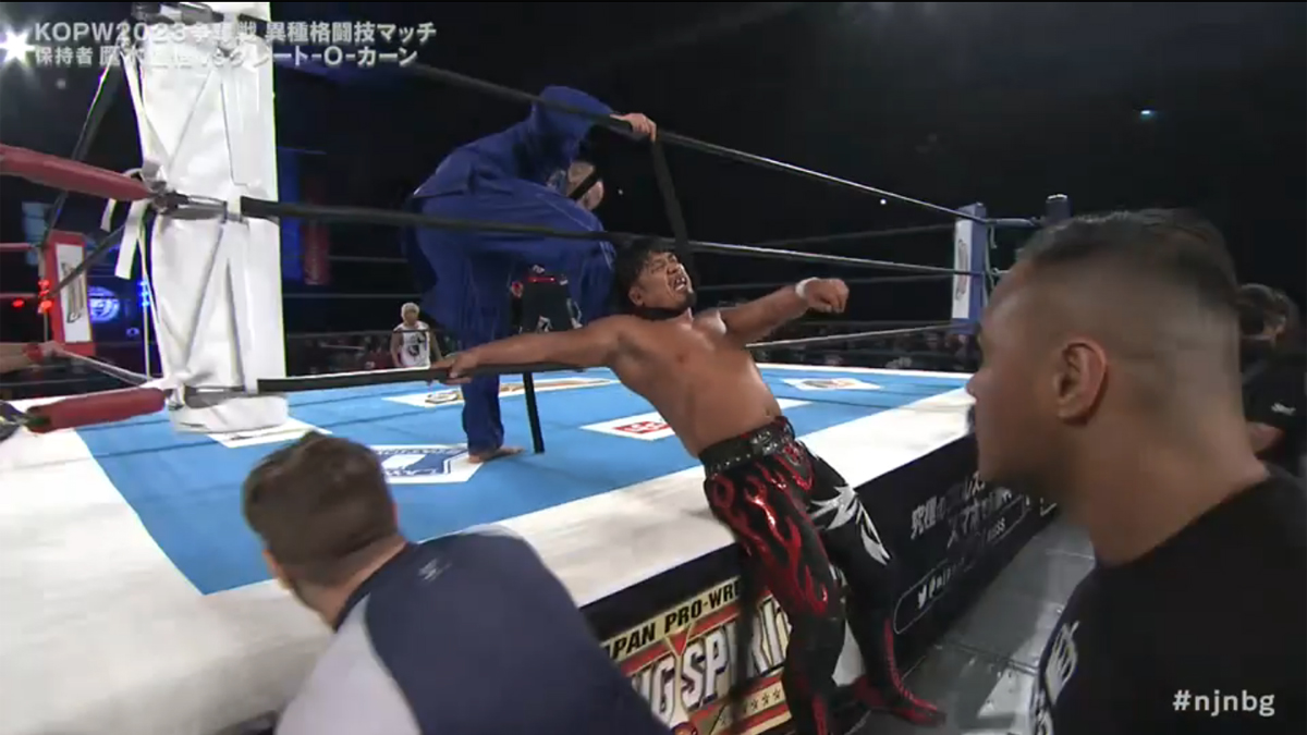 Shingo gets fed up and tosses off his Gi, much to the delight of the fans. Shingo forsakes the MMA nonsense and hits Khan with a DDT and a sliding lariat. Khan locks on a choke and Shingo’s only hope for escape is the ropes. Khan smothers Takagi with his Gi. Khan takes off his belt and begins strangling Shingo. Hiromu Takahashi gets on the apron to protest and Francesco Akira rushes into the ring and knocks Hiromu back out. Khan asks Akira to leave.
